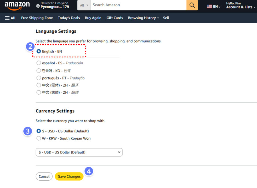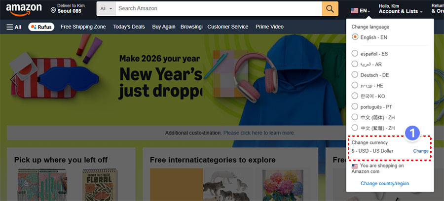 예시는 미국아마존을 진행한다고 가정해보겠습니다. 우측 상단의 국가를 클릭하신 후, 선택창이 열리면 Change 버튼을 클릭합니다.