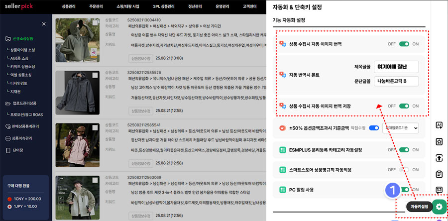 상품수집시 이미지 번역후 저장까지 적용 합니다. 자동저장까지 적용 하려면 2개의 스위치를 On 하세요.