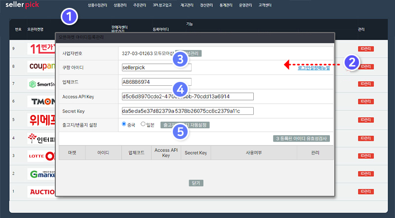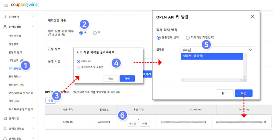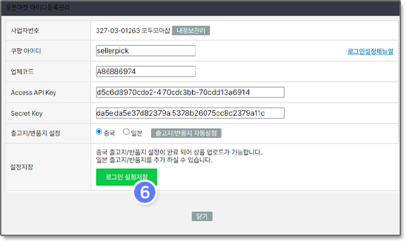 쿠팡윙 접속 아이디, 업체코드, Access Key, Secret Key를 순서대로 입력합니다.