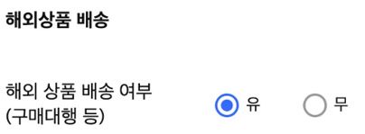 화면 중간에 "해외상품 배송" 여부 체크 항목이 있으며, "유"를 선택한 후 저장 버튼을 클릭해 주세요.
