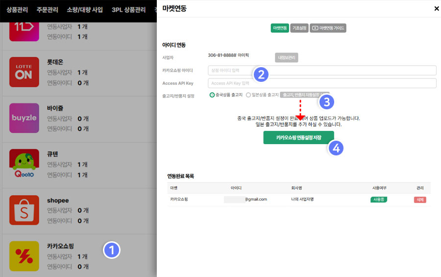 연동할 국가를 선택하고 "출고지/반품지 자동설정" 버튼을 클릭 합니다.