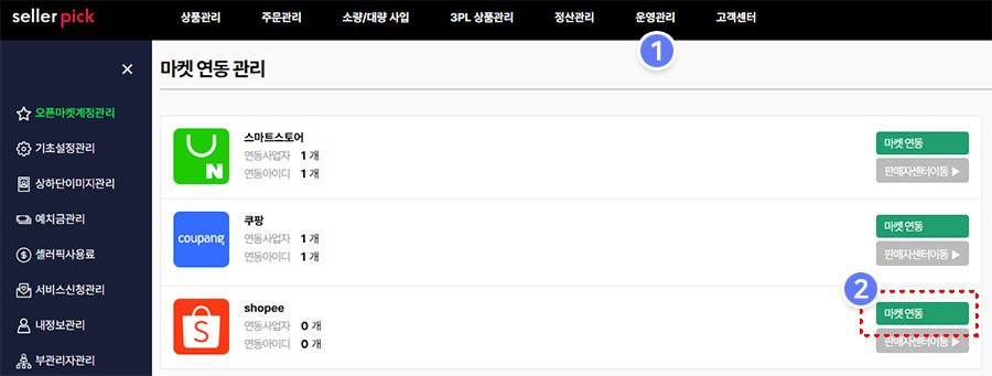 오픈마켓계정관리 리스트 하단에 shopee 로고를 확인 하시고 "마켓연동" 버튼을 클릭 하세요.