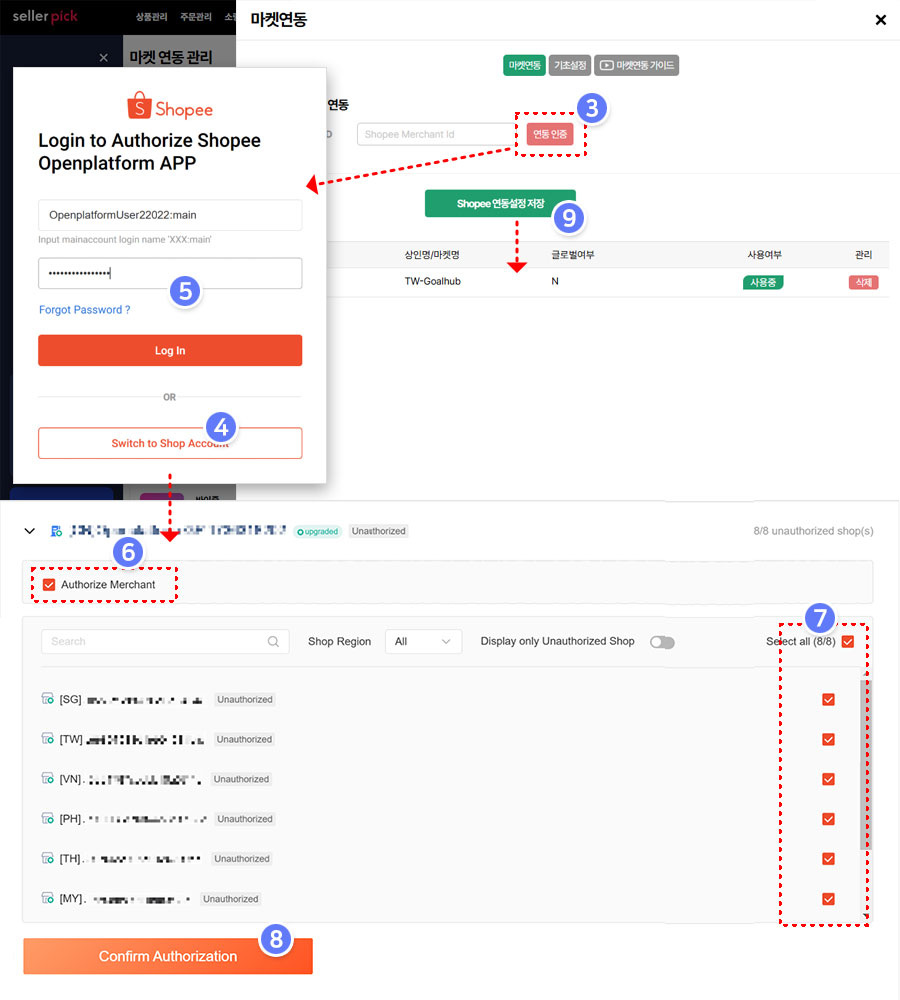 연동인증을 클릭 하시면 Shopee 로그인 페이지로 이동 됩니다.