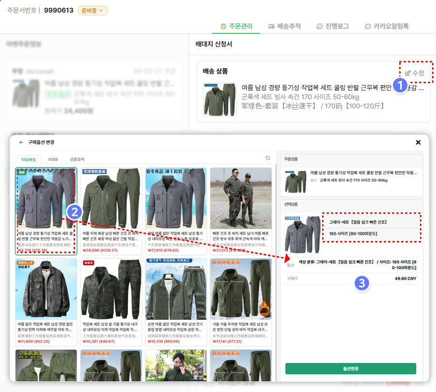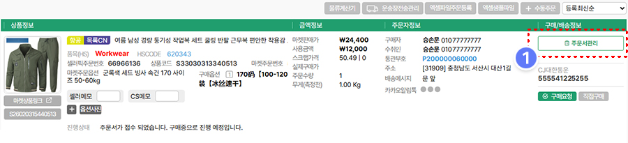 배대지 주문서의 우측에 "주문관리" 버튼이 있습니다. 클릭 하시면 주문을 처리하기 위한 다양한 기능을 제공 합니다.