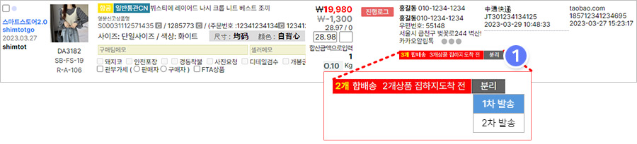 발송차수를 선택 합니다. 예제 이미지는 2개의 합배송이며 1차와 2차를 선택 하실 수 있습니다.