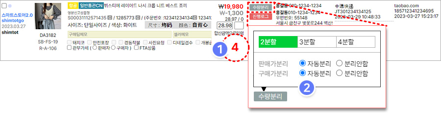 수량이 1개 이상인 경우 "수량분리" 버튼이 표시됩니다.