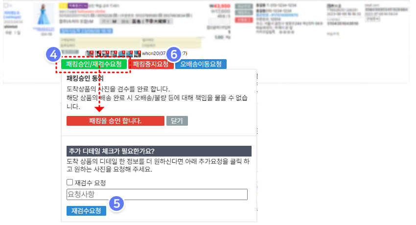 셀러님이 불량이라고 판단하신다면 패킹 승인 대신 오배송이동요청을 클릭하세요.