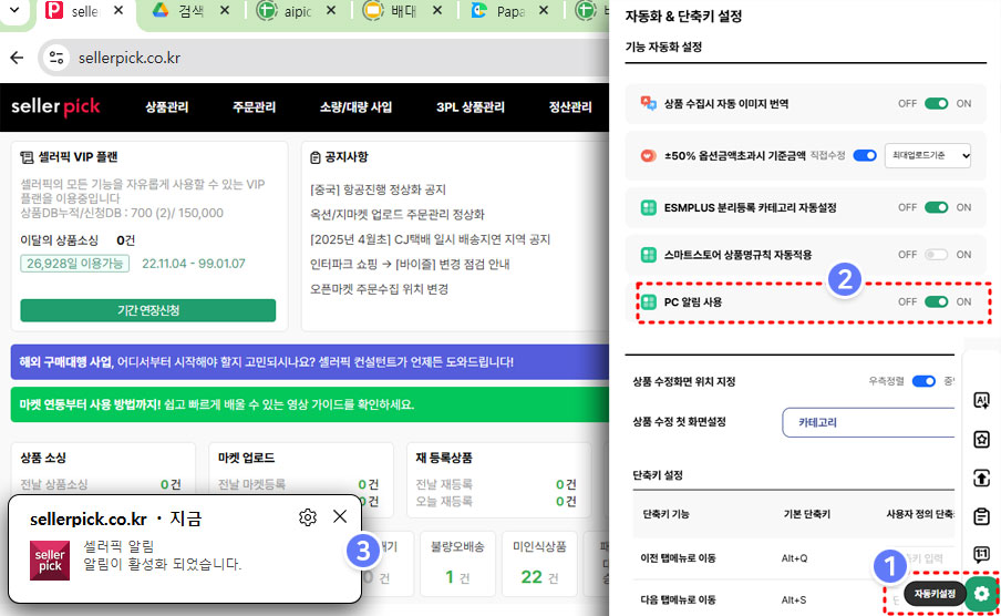브라우저 허용이 완료 되었다면 셀러픽 자동키 설정 아이콘을 클릭 하세요.