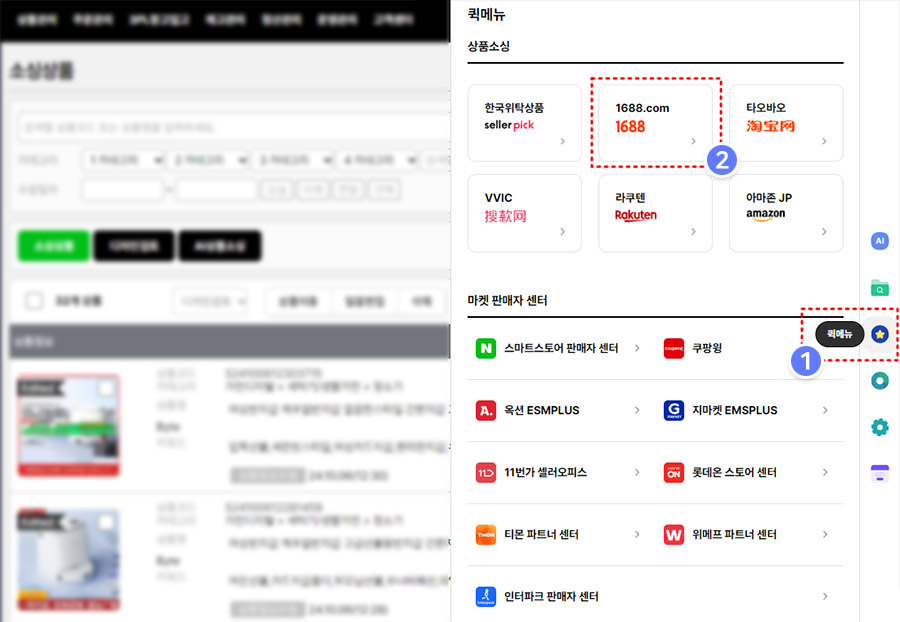 셀러픽에 로그인 하시면 우측에 퀵메뉴가 있습니다.