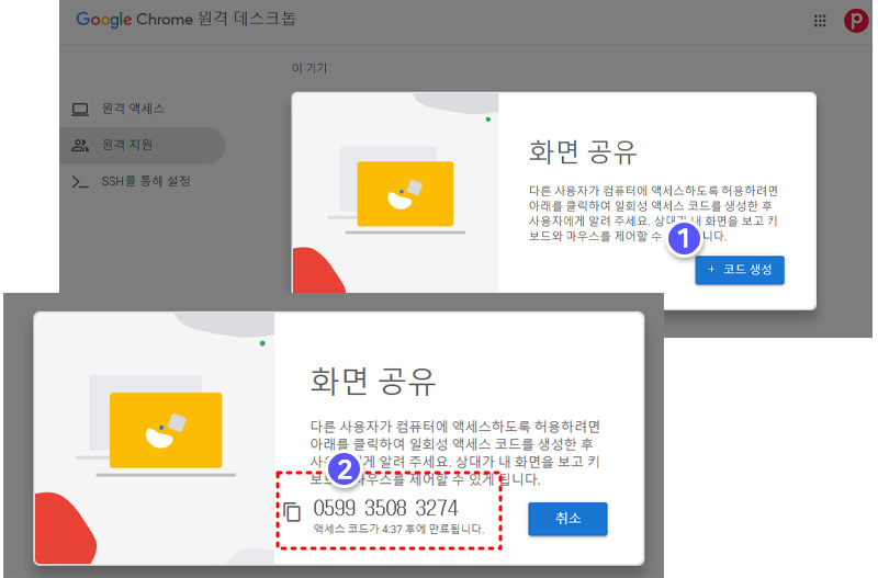 크롬 원격 데스크톱 화면에서 "원격 지원" > "화면 공유"를 확인합니다.