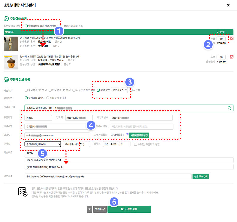 수입하시는 사업자를 선택해 주세요. 사업자 영문등 빈칸이 있다면 입력해 주세요.