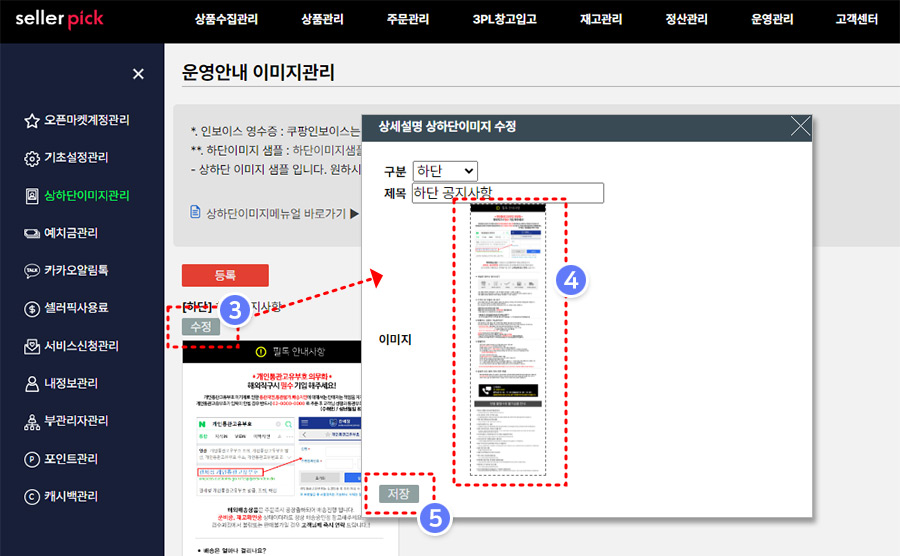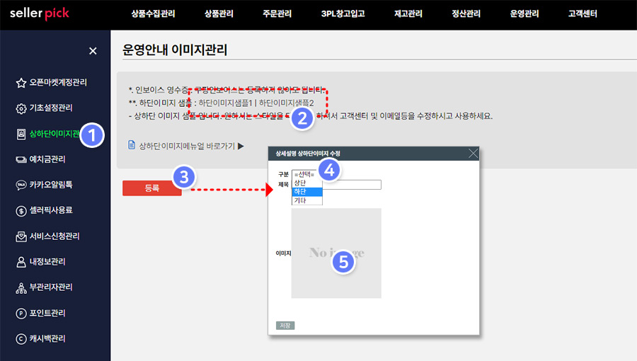 지마켓, 옥션, 11번가, 바이즐, 롯데온은 셀러픽 이미지서버를 바라보고 있습니다. 셀러픽 상하단 이미지관리에서 이미지를 수정한다면 7개 마켓은 자동으로 변경됩니다.