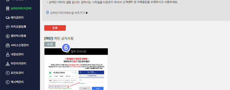준비하신 하단 공지사항 이미지를 첨부 하고 "저장" 클릭 하시면 완료됩니다.