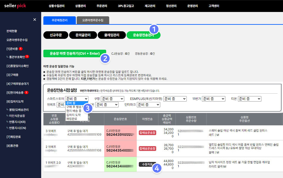 "운송장 마켓 전송하기" 버튼을 클릭하면, 리스트의 전송 대상을 모두 일괄 업데이트합니다.